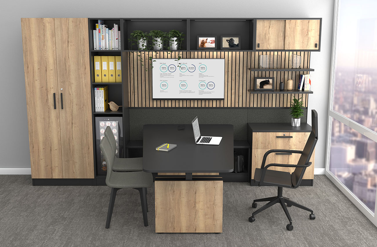 All Staverton products use 60-80% recycled MFC, with the remaining amount sourced from sustainable FSC sources. We use 100% recycled steel and 100% recycled polyester for upholstery fabric, and we purposefully avoid foam-backing or adhesives when using fabrics to support easy recycling. Additionally, the sit-stand actuators and controls used in the SOS and SL ranges contain 30-40% recycled materials, and all our cables and electrics are fully recyclable.