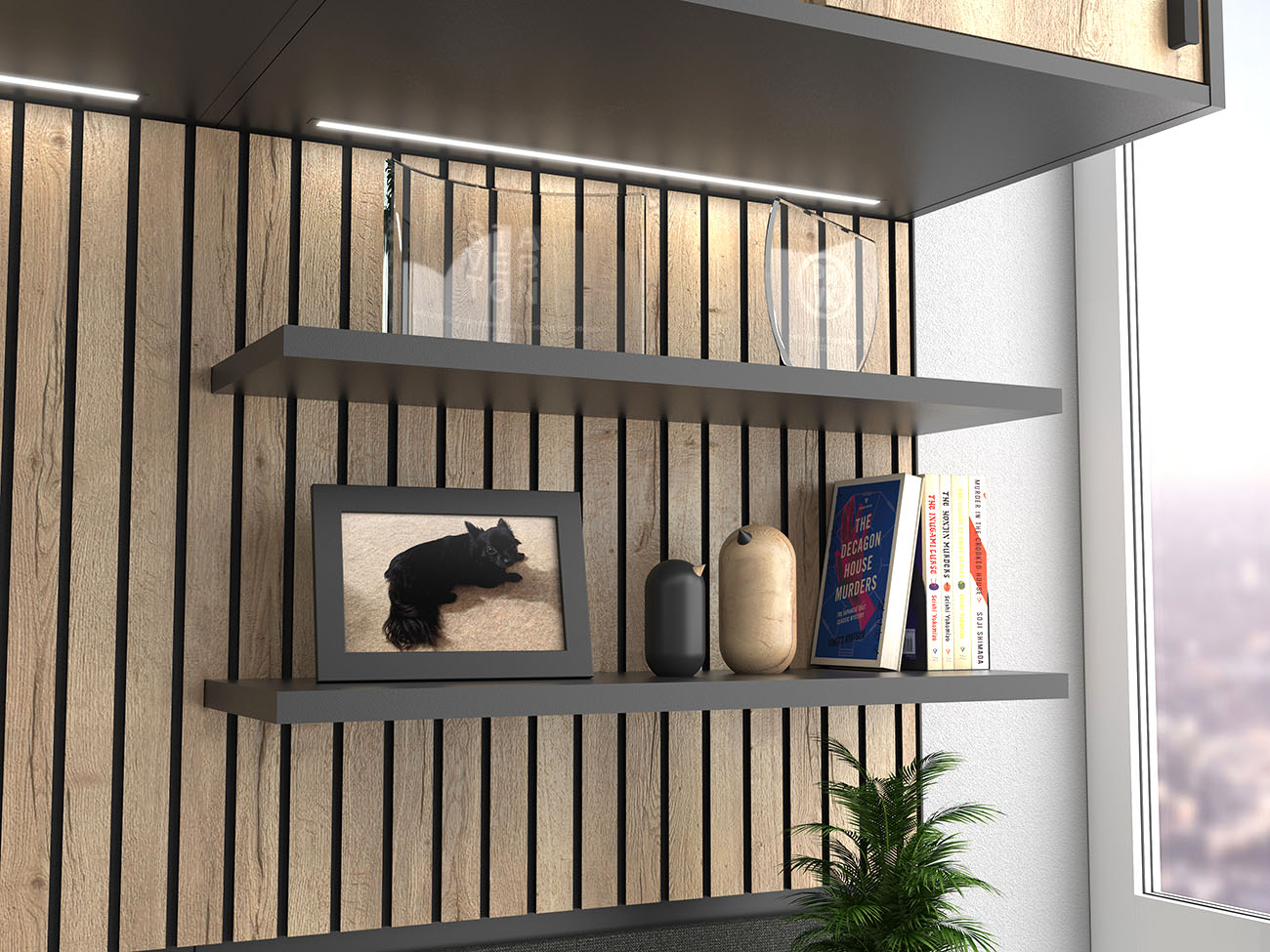 EX also offers a highly contemporary aesthetic thanks to the smooth, seamless worktop edge with no visible bonding line, the back chamfer shapes, and the slat wall fascia panels in real-wood laminate effect with black slat detail, which can accommodate floating shelves.